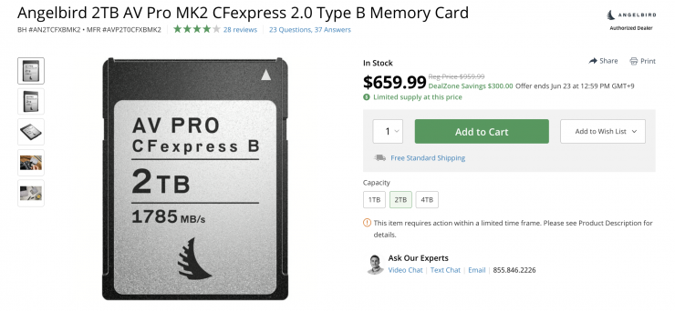 The Angelbird 2TB AV Pro MK2 CFexpress 2.0 Type B Memory Card is on sale for $659.99 USD which is a saving of $300 USD.