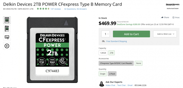 The Delkin Devices 2TB POWER CFexpress Type B Memory Card is on sale for $469.99 USD which is a saving of $280 USD.