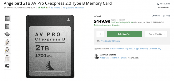 The Angelbird 2TB AV Pro CFexpress 2.0 Type B Memory Card is on sale for $449.99 USD which is a saving of