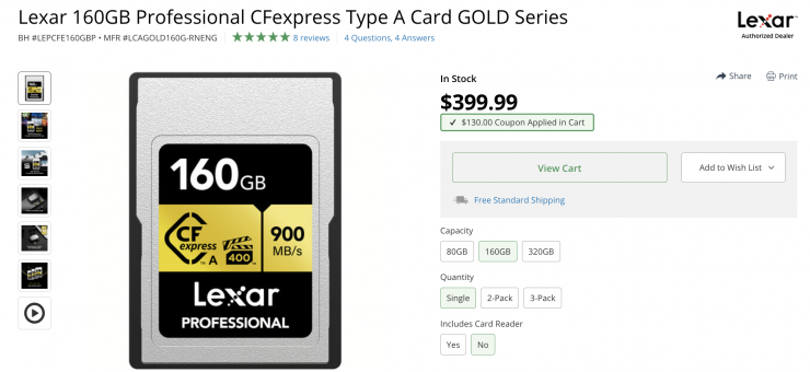 The Lexar 160GB Professional CFexpress Type A Card GOLD Series is on sale for $269.99 USD which is a saving of $130 USD.