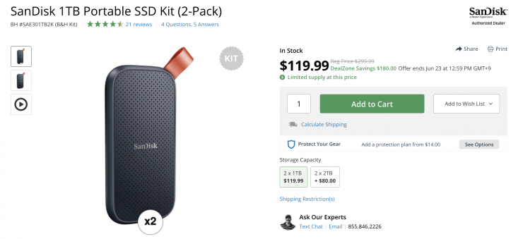 The SanDisk 1TB Portable SSD Kit (2-Pack) is on sale for $119.99 USD which is a saving of $180 USD.