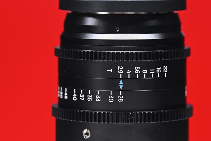 On the operator’s side of the lens, the focus markings are in feet, and on the non-operators side, they are in meters. All of the markings line up correctly which is what I would expect. Yes, it arguably would have been better to see two separate versions made in both feet or meters, but for affordable cine lenses that would just end up increasing the price.