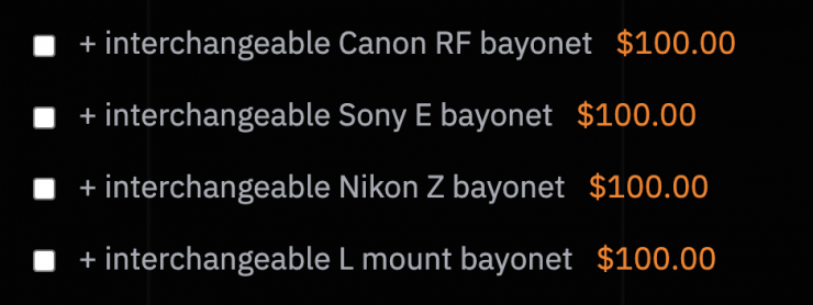 You can also buy additional Canon RF, Sony E, Nikon Z, and Leica L user changeable mounts for $100 USD each.