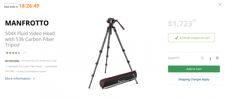 The Manfrotto 504X Fluid Video Head with 536 Carbon Fiber Tripod is on sale for $999.88 USD, which is a saving of $724 USD.