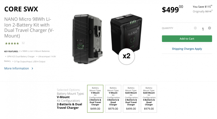The Core SWX NANO Micro 98Wh Li-Ion 2-Battery Kit with Dual Travel Charger (V-Mount or G-Mount) is on sale for $499 USD, which is a saving of $115 USD.