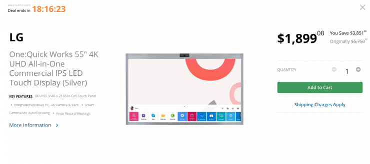The LG One:Quick Works 55″ 4K UHD All-in-One Commercial IPS LED Touch Display (Silver) is on sale for $1,899 USD, which is a massive saving of $3,851 USD.