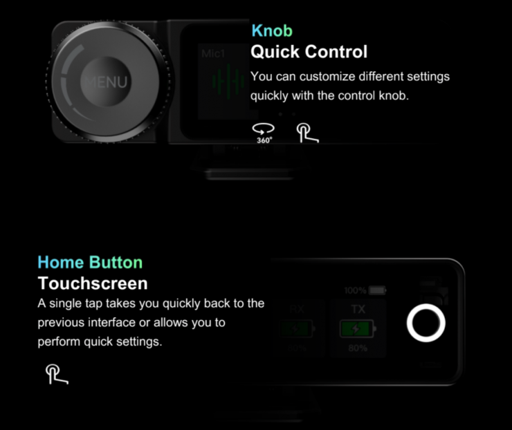 - AMOLED touchscreen on the receiver to display recording status, wireless information, and more