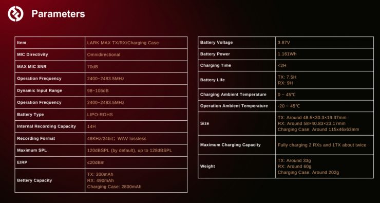 The LARK MAX comes with a compact charging case. The transmitter’s operation time is claimed to be 7.5 hours. The receiver can be charged and used at the same time.
