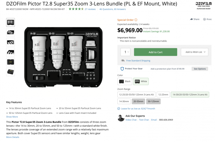 The DZOFilm Pictor T2.8 Super35 Zoom 3-Lens Bundle (PL & EF Mount, White) is also on sale for $6,969 USD which represents a saving of $1,200 USD.