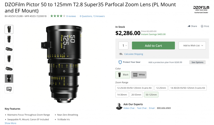 The DZOFilm Pictor 20-55mm and 50-125mm T2.8 Super35 Zoom Lens Bundle (PL and EF Mount, White) is on sale for $4,929 USD, which is a saving of $870 USD.