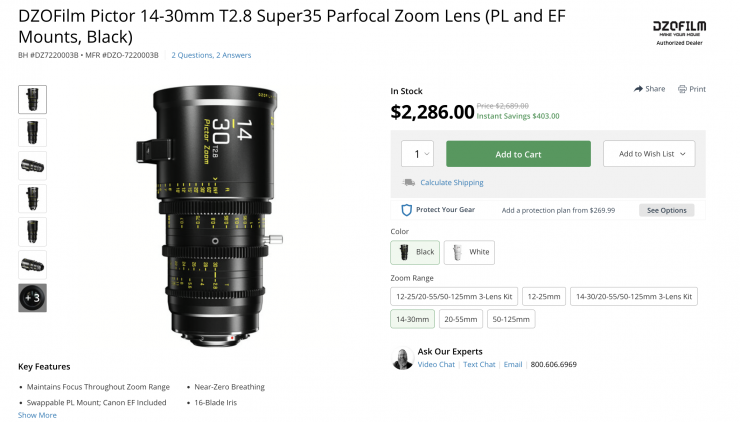 DZOFilm Pictor 14-30mm T2.8 Super35 Parfocal Zoom Lens (PL and EF Mounts, Black) $2,286 USD