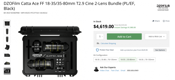 The DZOFilm Catta Ace FF 18-35/35-80mm T2.9 Cine 2-Lens Bundle (PL/EF, Black) is on sale for $4,619 USD which is a saving of $1,980 USD.