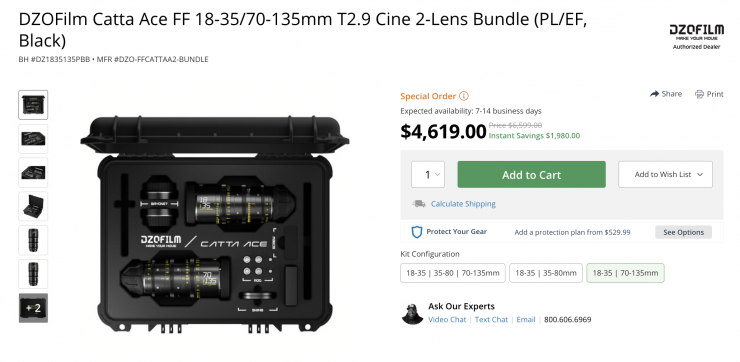The DZOFilm Catta Ace FF 18-35/70-135mm T2.9 Cine 2-Lens Bundle (PL/EF, Black) is on sale for $4,619 USD which is a saving of $1,980 USD.