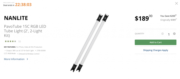 The Nanlite PavoTube 15C RGB LED Tube Light (2′, 2-Light Kit) is on sale for $189 USD, which is a saving of $200 USD.