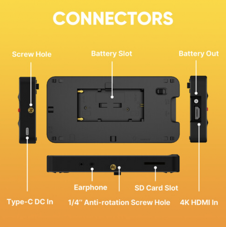 The monitor supports signals of up to UHD 4K30 via HDMI. As far as power is concerned you can run the monitor via the in-built LP-E6, L-Series battery plate, or from the USB-C DC input. There is also a barrel (8.4 VDC) output, a headphone jack, and an SD card slot.