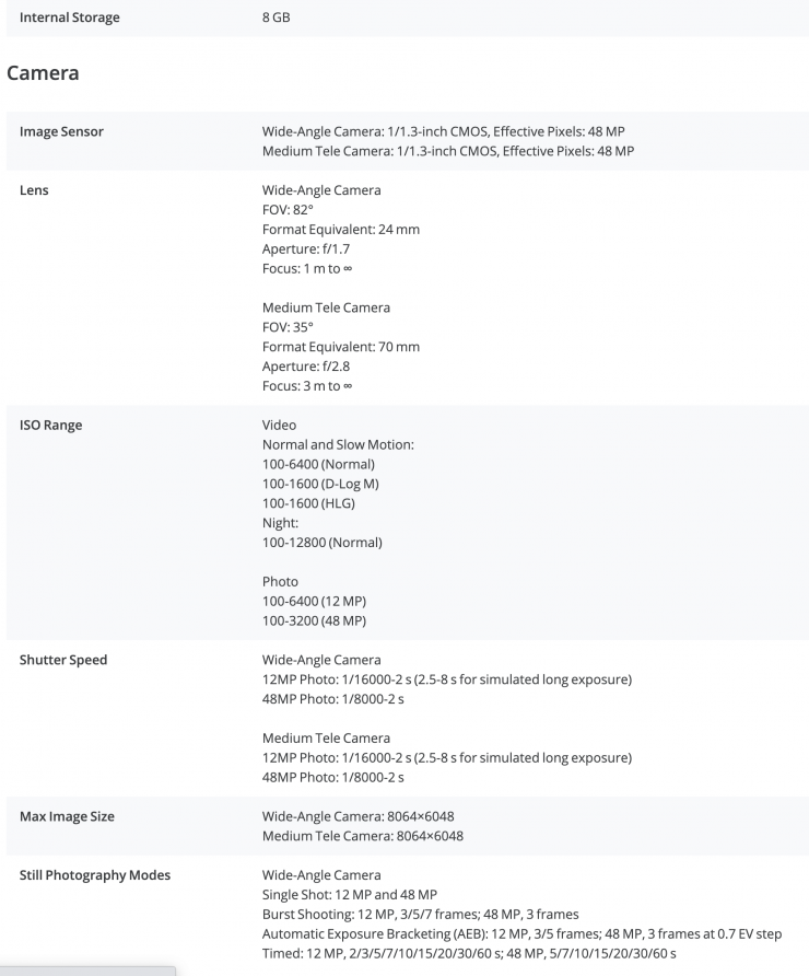 The wide-angle camera has a 2.4μm pixel size, 24mm format equivalent and an F1.7 aperture. The 3x Medium Tele Camera has a 2.4μm pixel size, 70mm format equivalent, and an F2.8 aperture.