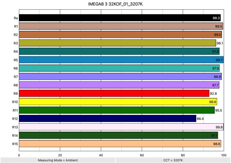 Above are the scores for the light when used at 3200K. The scores show that the light does a very good job of accurately replicating a 3200K (Tungsten) source. Any score in the mid to high 80’s is outstanding for an LED light.