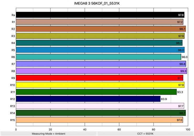 These were very good results across the board. There was nothing here that anyone should be concerned about and the ⊿uv scores at 3200K and 5600K were outstanding. The light also doesn’t lean green or magenta in any noticeable way across its CCT range. The CC Index scores were right up there with some of the best lights I have reviewed.