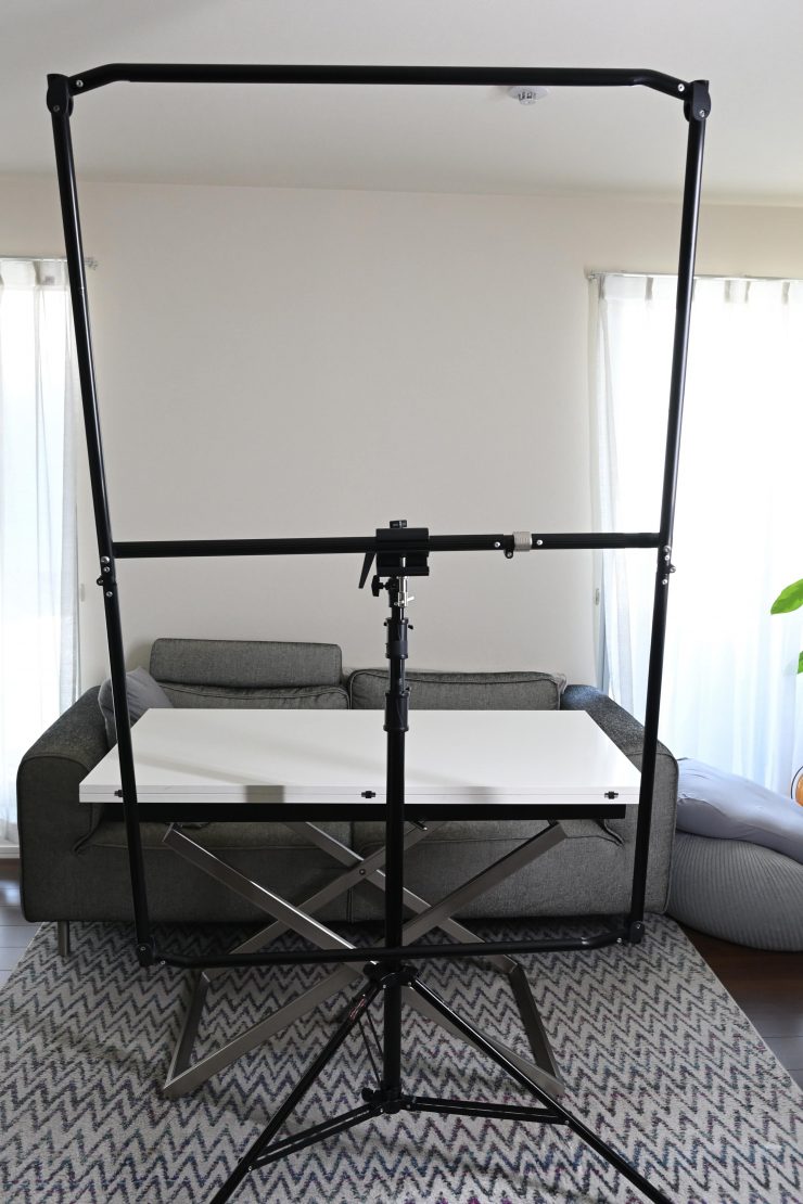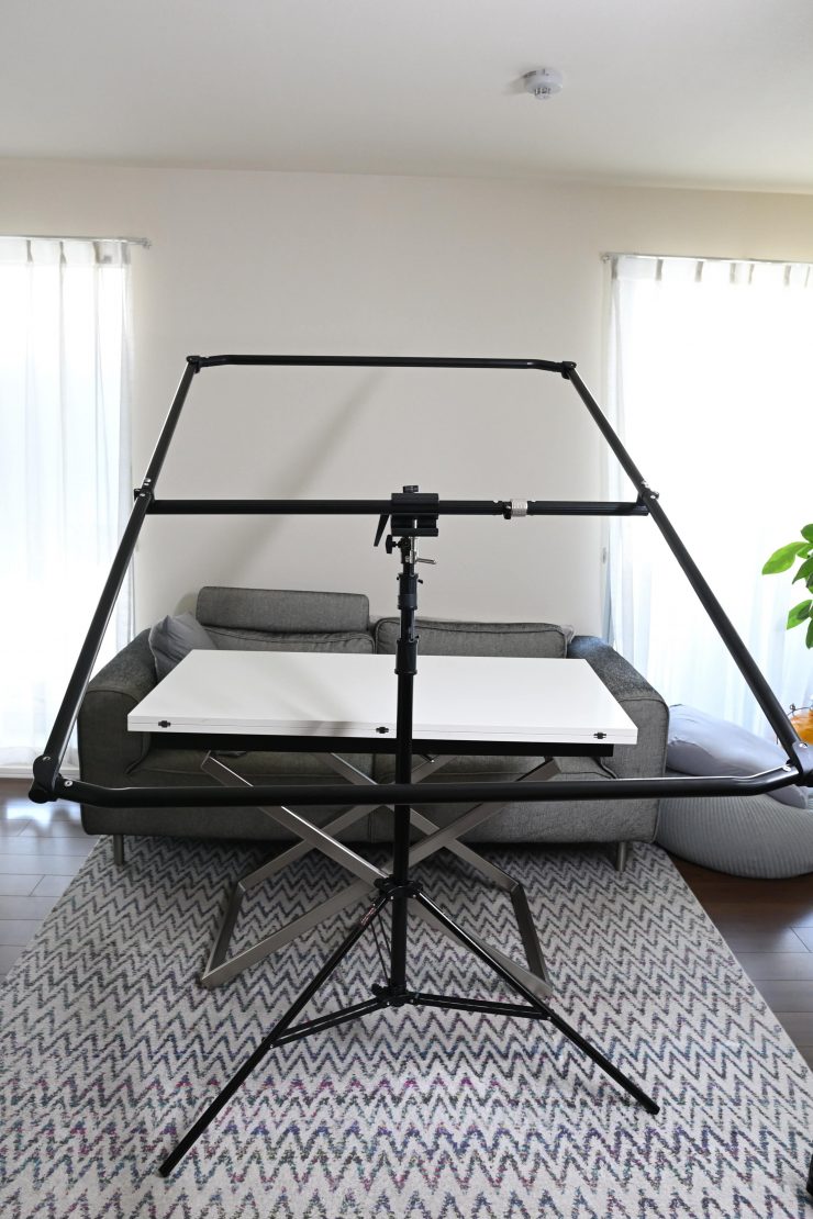 Above all I have done is to put the light on a boom stand positioned sideways by placing the elastic corners of the boom arm. I then use another stand at the front to create the v shape. The only problem with this solution is when it comes to the diffusion. As you can’t use it with the diffusion frame when positioned like this you have to place the diffusion close to the light. I would recommend using two layers of diffusion if you configure the light in this type of position.
