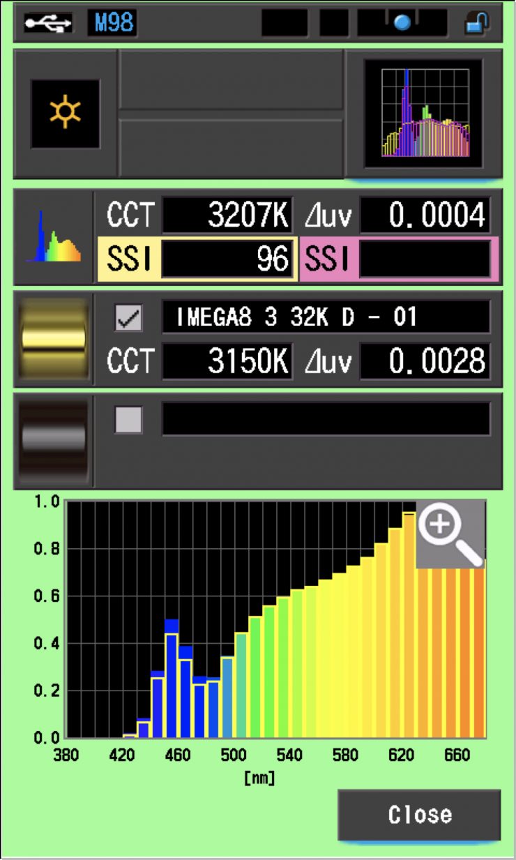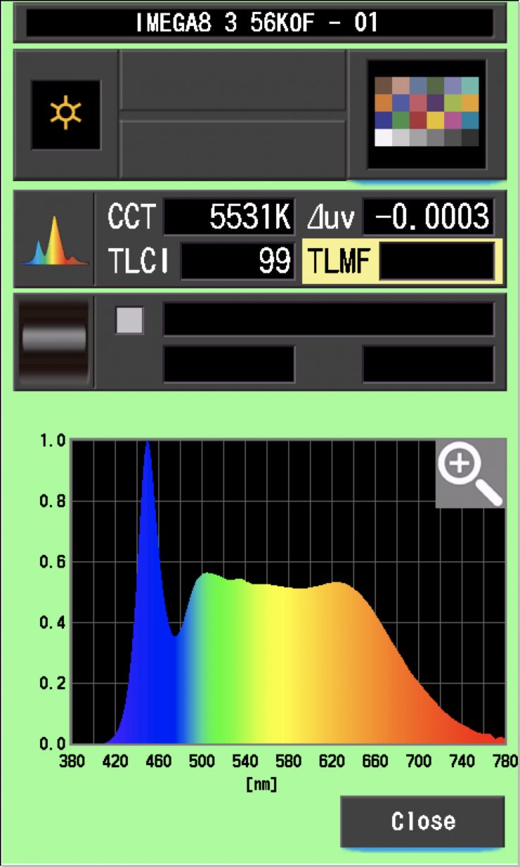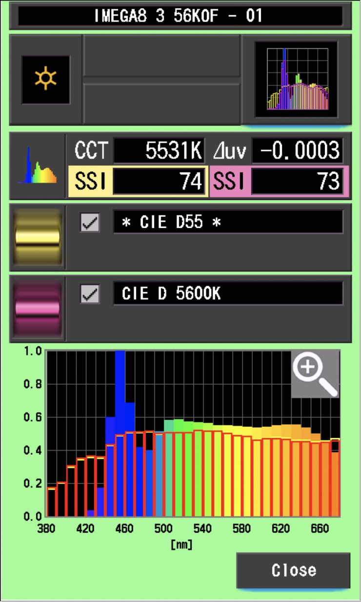 SSI (Spectral Similarity Index) was developed by the Sci-Tech Council of the Academy. SSI gives me the ability to set any light as a standard, or use predefined standards (such as CIE D55), and then give other lights an SSI score based upon how well they will match standards such as CIE D55 measure spectral response and compare it directly against an ideal light source.