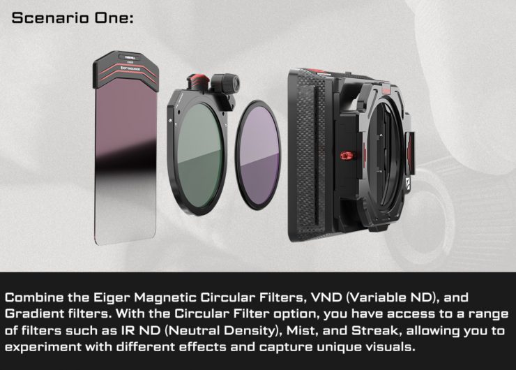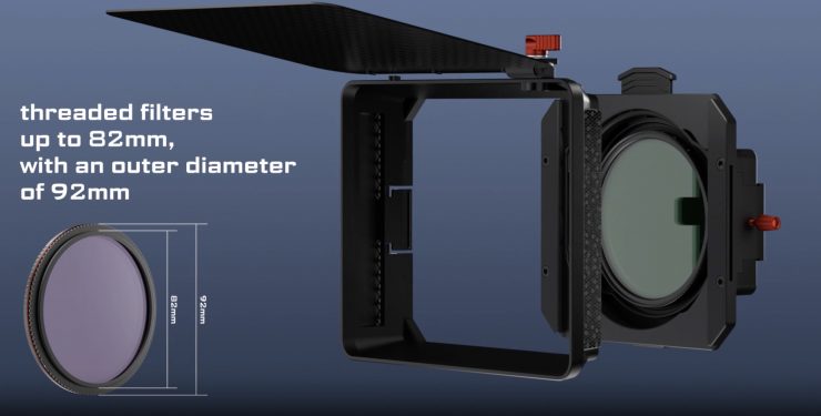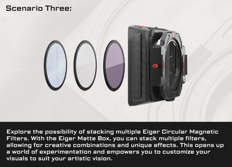 The Eiger Matte Box allows you to incorporate optional filters (VND, Gradient, Mist, Steak, Straight ND) in one system. There is also an adjustable carbon fiber top flag that minimizes glare or flare.