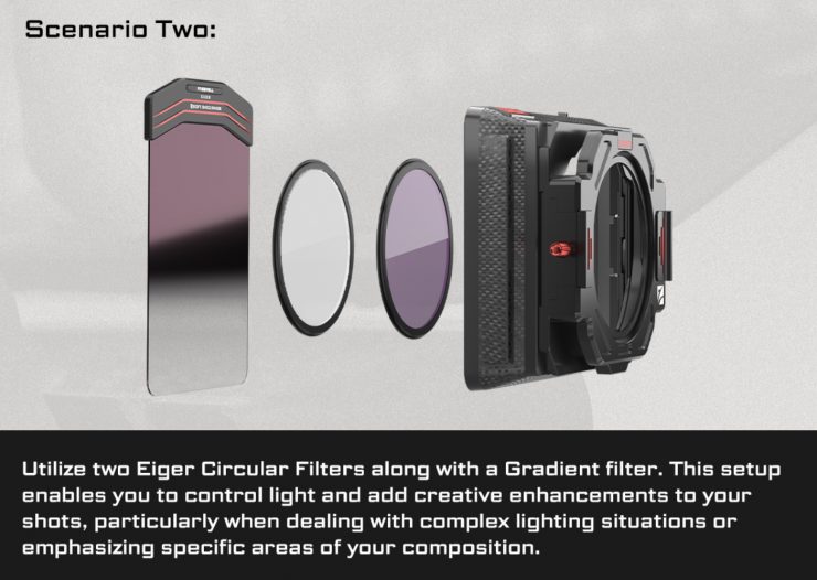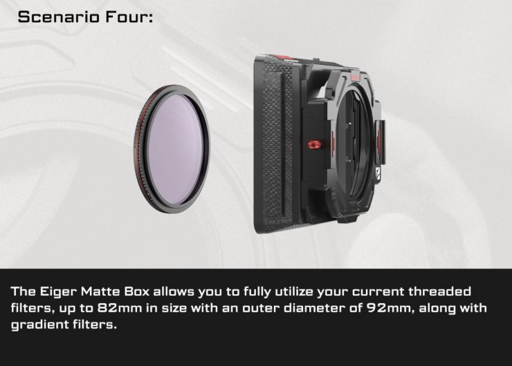 The Eiger Matte Box system is compatible with insert filters and magnetic or threaded filters. What you need to be clearly aware of is this matte box doesn’t work with traditional 4 x 4″ or 4 x 5.65″ filters. The inset filters Freewell refers to are their own graduated ND ones.