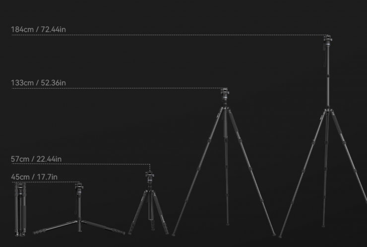 The tripod is constructed with durable, lightweight aluminum and it has a maximum operating height of 72.4″ / 183.89cm with its column extended, and it folds down to 17.7″ / 44.95cm in length for transport in the included carrying bag.