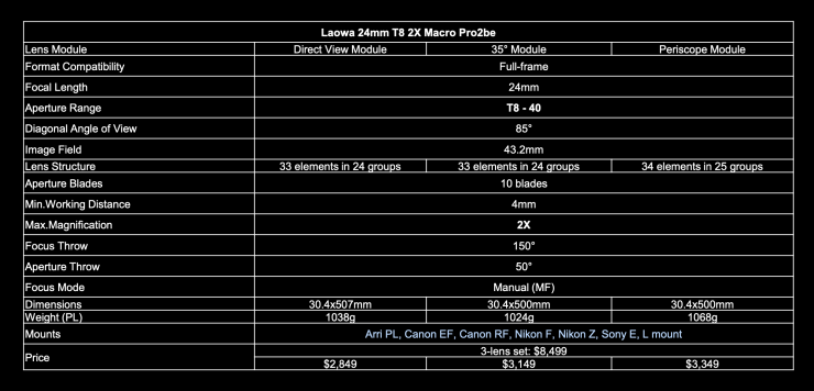 The Laowa 24mm T8 2X Pro2be 3 Lens Set retails for $8,499 USD. You can buy the three individual Pro2be lenses separately for the following prices: