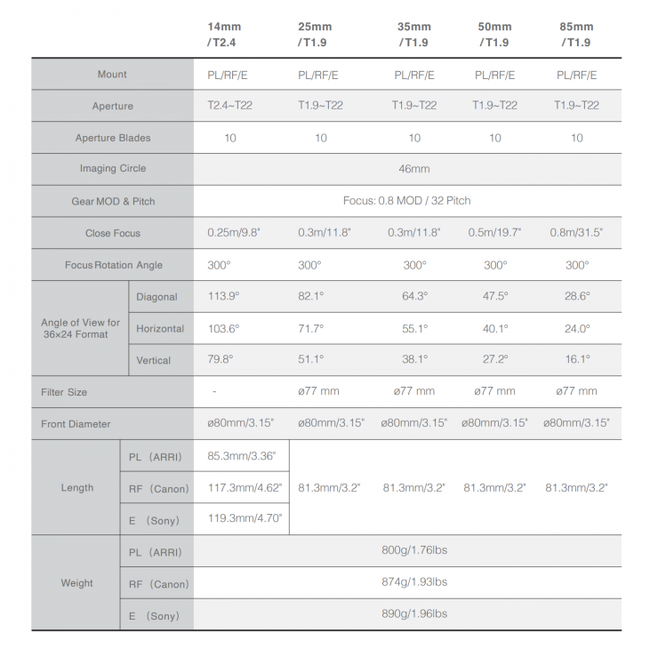 | NiSi Athena 14mm T2.4 | 28.6 oz / 812 g | |