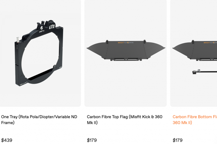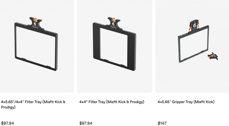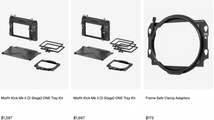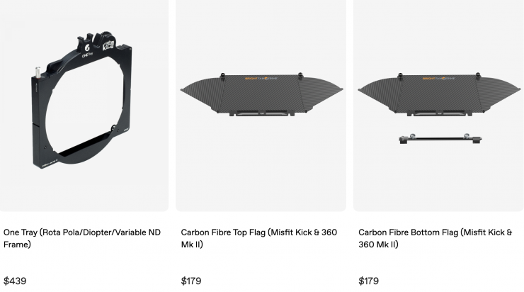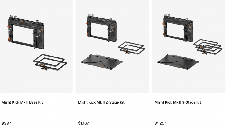 The Misfit Kick Mk II is available in various kit configurations with a variety of accessories. The Base Kit includes the core unit and two 4 x 5.65″/4 x 4″ filter trays. The 2-Stage Kit adds a Carbon Fiber Top Flag for improved control over sun flares, while the 3-Stage Kit adds a third filter tray. The 2-Stage ONE Tray Matte Box Kit and 3-Stage ONE Tray Matte Box Kit include the same accessories as the aforementioned kits, along with a ONE Tray, which expands filter compatibility to allow you to use 138mm round filters.