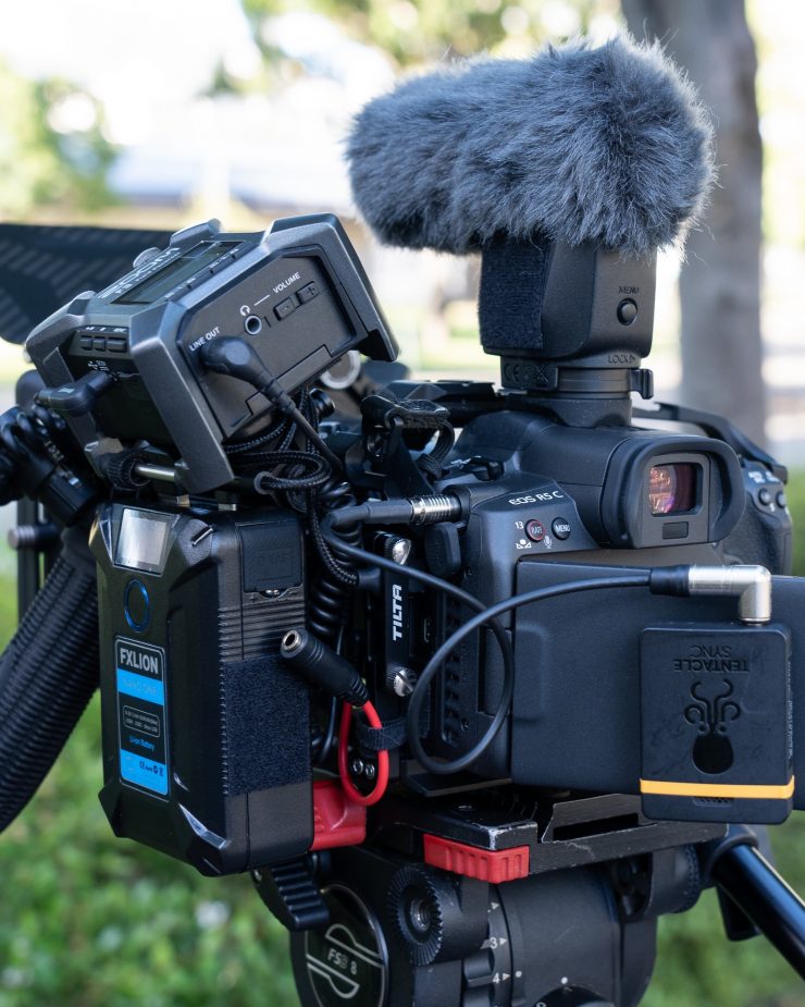 Now, the F3 does not have a timecode port, and adding a Tentacle Sync to it would mean losing one audio channel. So for sit-down multicam interviews, I prefer to use a Zoom F6 recorder, which has a timecode port (there is a timecode solution when using the Ultra Sync BLUE system, but unfortunately this one does not mix and match with other systems like Tentacle does with Deity for example.