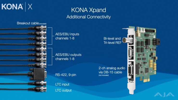 - Optional KONA Xpand board provides Bi-level / Tri-level Video Reference (BNC), LTC in/out, RS-422, 8-channels of AES/EBU audio (with included breakout cable) and 2-channels of analog audio in and out (via user supplied DB-15 to XLR cable)