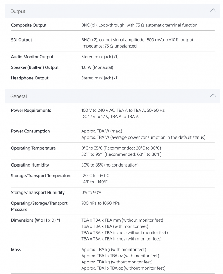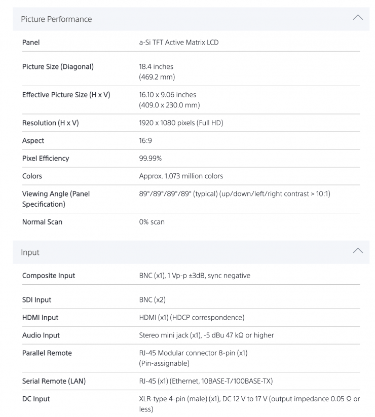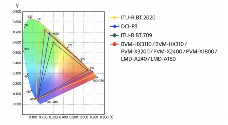 According to Sony, the LMD-A180’s color gamut is wide and the same as the color gamut of BVM-HX3110, BVM-HX310, PVM-X3200, PVM-X2400, PVM-X1800 and LMD-A240. Their colors are claimed to be matched to each other on the screens.
