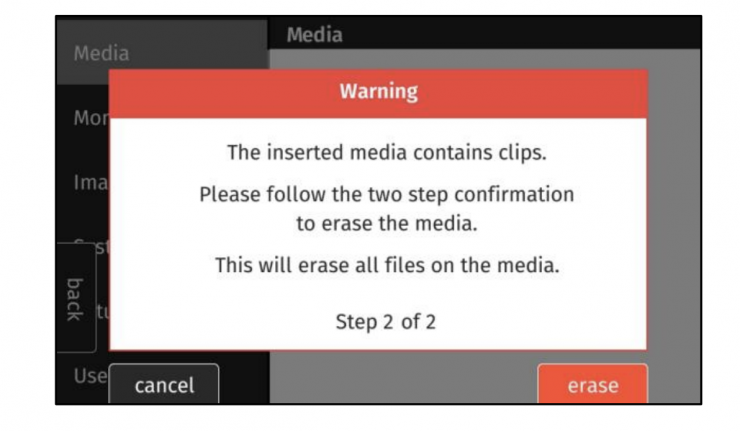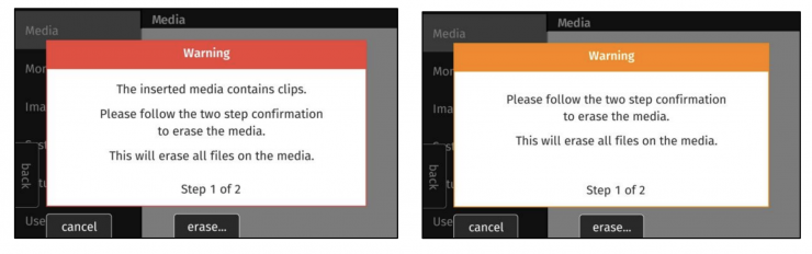 The erase media warnings on the MVF-2 flip-out monitor have been modified to offer more information about the media erase process. The color of the title background of the warning messages clearly communicates if there are camera clips on the card that are about to be erased (red title background) or not (orange title background).