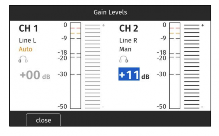 The new Audio Gain screen gives a quick overview of the current gain settings, the channel assignments, and monitoring settings. Gain levels can be adjusted by turning the MVF-2 click wheel or dragging on the scroll bar with your finger. You can access this by going to MVF-2 MENU > Recording > Audio Recording > Gain Levels