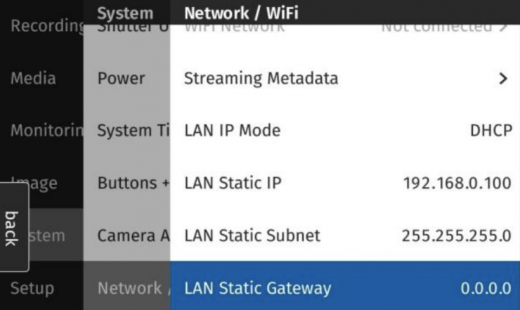 In certain setups, especially for virtual productions, there is a need to define a network static gateway. The default static gateway is a router that forwards network packets when no other route matches the destination of a packet. In a local network, the default gateway is typically the host that is one hop closer to the internet. The IPv4 address of the gateway typically is the first address in a subnet, e.g. 192.168.0.1. As a factory default, the gateway is set to 0.0.0.0. To access these settings you can go to MENU > System > Network/WiFi > LAN Static Gateway