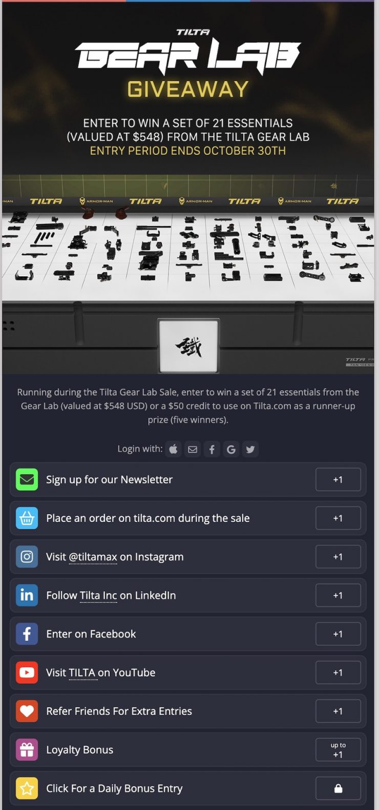 Tilta is having a big 20% off sale and giveaway starting today, October 25th through the 30th. The Tilta Gear Lab sale consists of a wide variety of useful accessories that are universally compatible and affordable.