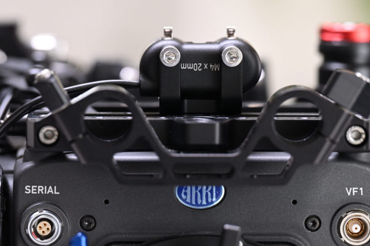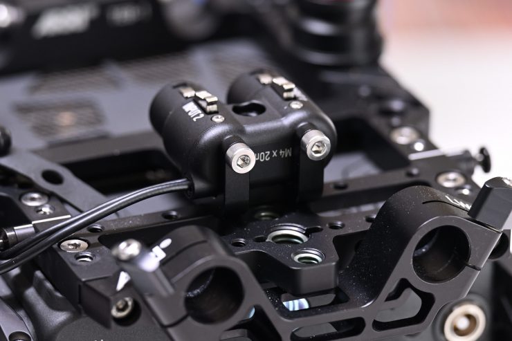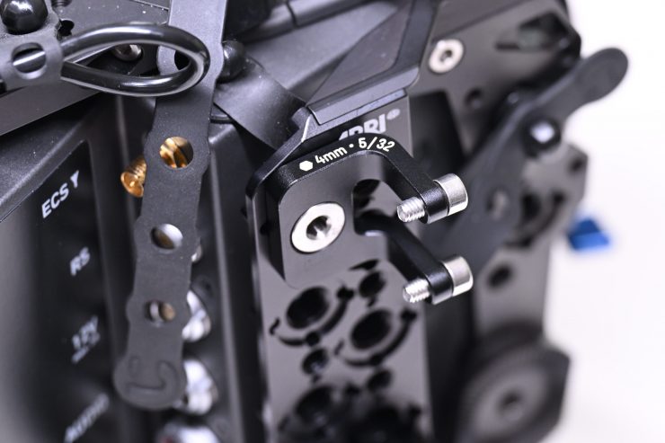 The MID49 Audio Breakout AB-7 attaches through the use of a captive 1/4-20 screw and rubber pad to ARRI’s camera cage components.