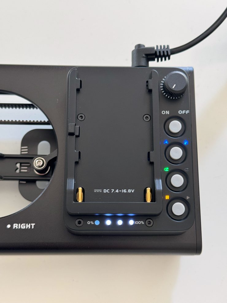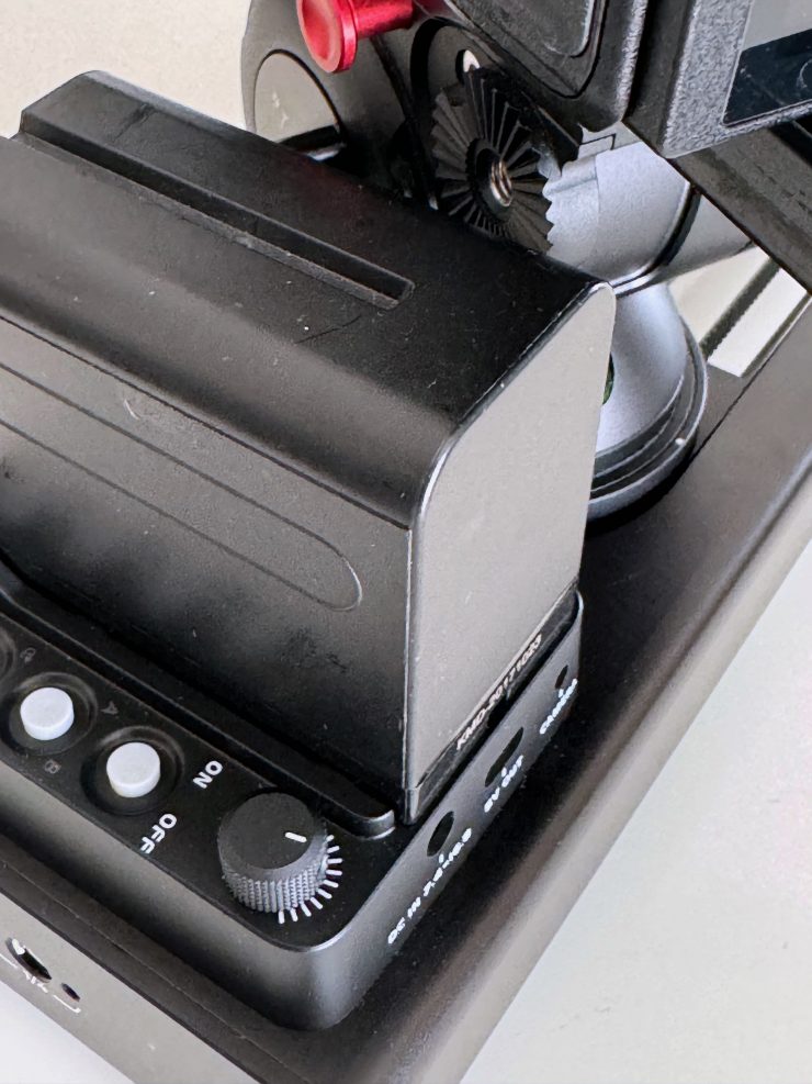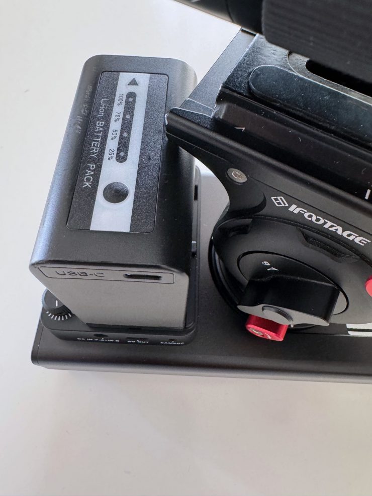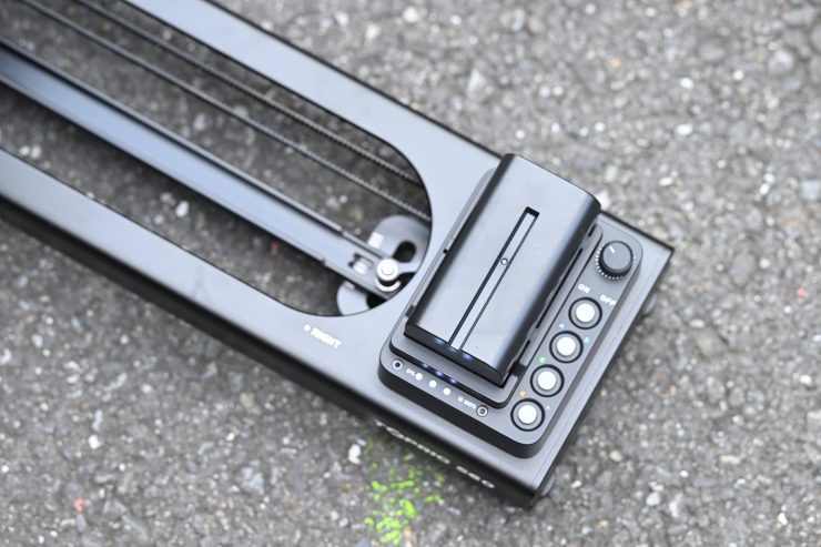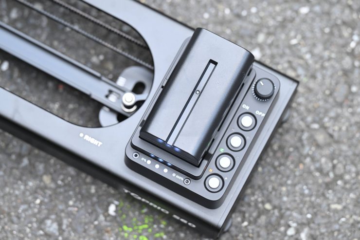 The slider can be powered by a single Sony NP-F-type battery. A F-550-sized battery is claimed to be able to run the slider for up to 60 hours.