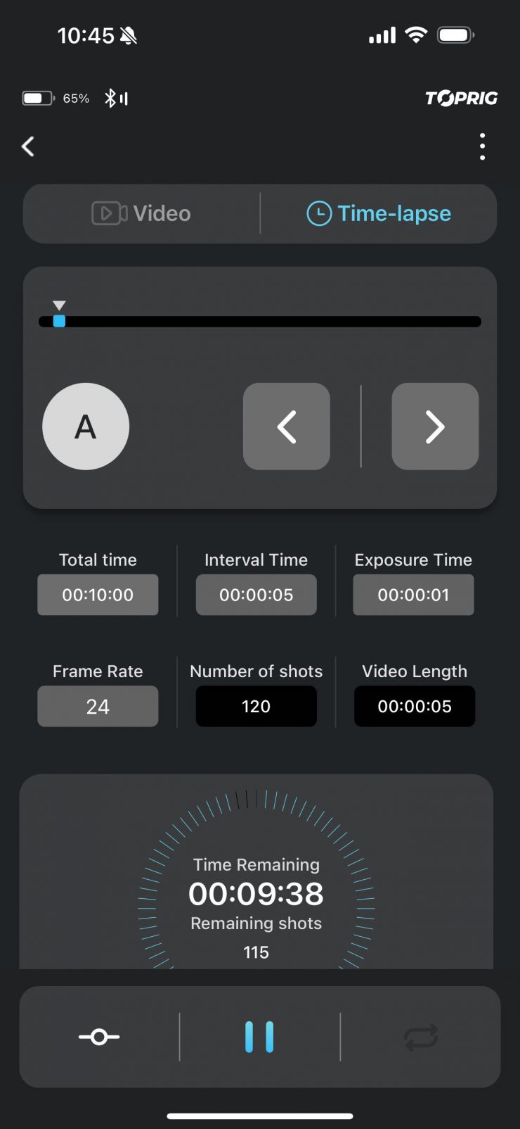 Now, while you can just control the slider using the onboard controls, you really do need the TopRig iOS app that works via Bluetooth. Without the app, you can’t access the Timelapse mode as there are no controls onboard the slider for setting that up.