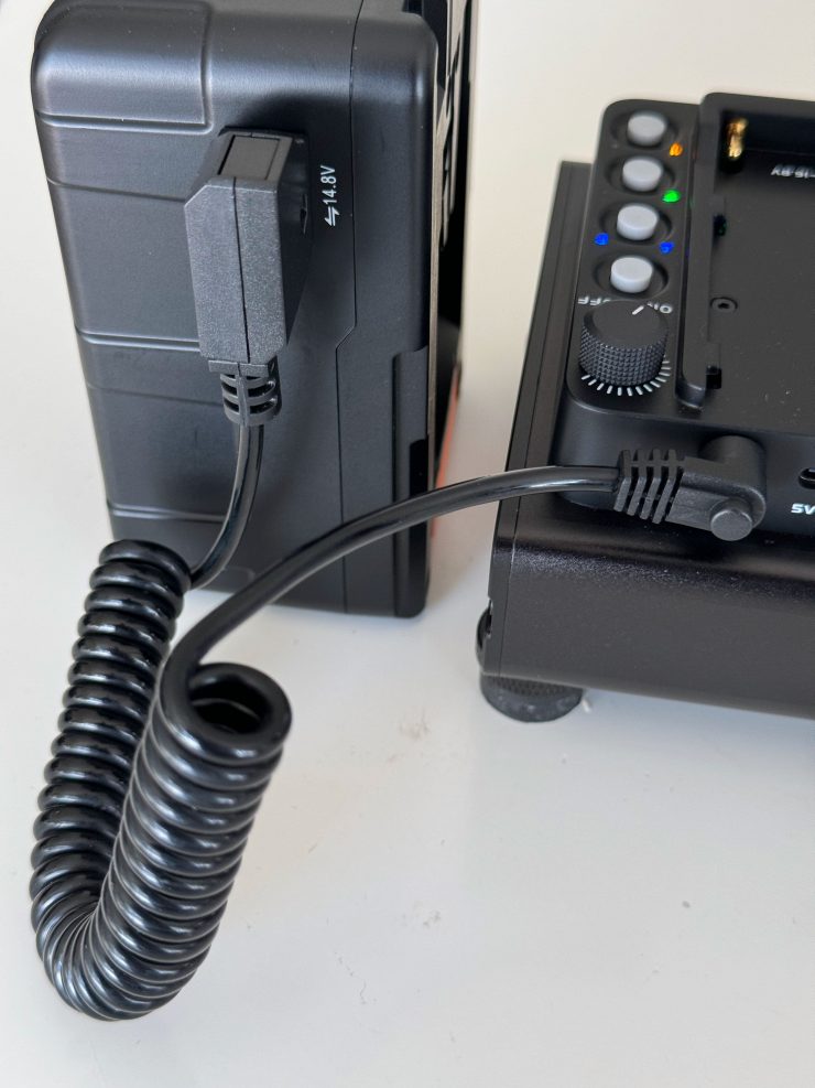 Alternatively, it can be powered using 7.4V-16.8V DC via a barrel connector. I tried powering the S60 with a V-lock camera battery and a DC barrel connector to D-tap cable and it worked well.