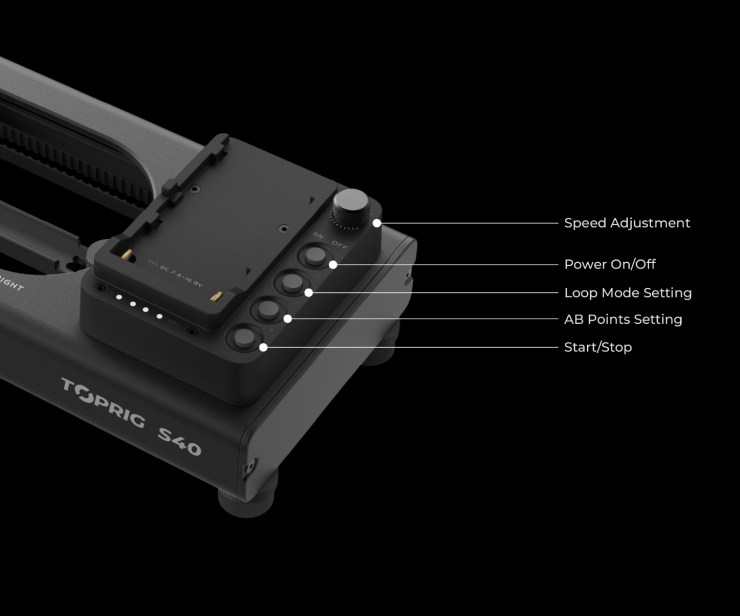 On the slider itself, there is a dial that changes how fast the slider will move, a power on/off button, buttons for setting A and B points, a continual loop button, and a start/stop button.