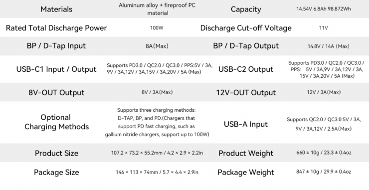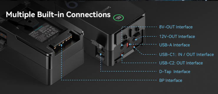 It also has more interfaces than the VB99, such as D-tap, USB-C, USB-A, DC 8V, and DC 12V.