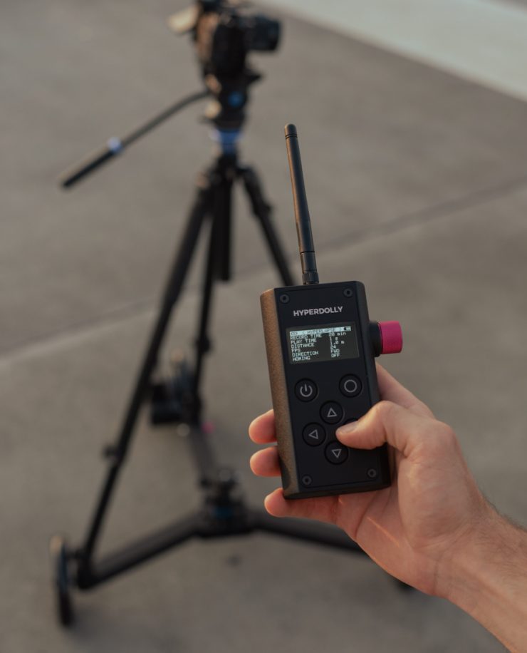 Hyperdolly is operated via a dedicated remote controller that has a control range of 100m+. It is powered by a set of two 14500 batteries that provide a runtime of 5 hours.