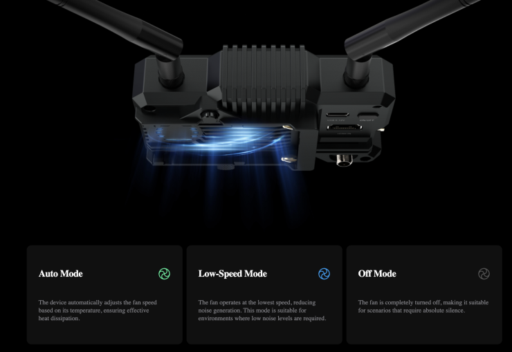 The Mars 400S Pro II is equipped with a three-speed fan adjustment feature (Auto, Low Speed, Off). Its intelligent cooling design allows it to perform optimally in various usage scenarios by reducing device temperature and ensuring stable signal transmission.