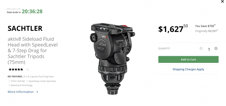 The Sachtler aktiv8 Sideload Fluid Head with SpeedLevel & 7-Step Drag for Sachtler Tripods is on sale for $1,627.50 USD, which is a saving of $700 USD.