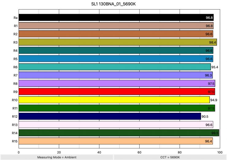The CRI Ra (average CRI) is 96.8 and has an extended rating of 96.47. This is a very good score. As you can see, the R12 (dark blue) scored 90.5 which is the lowest score of the fifteen color values.