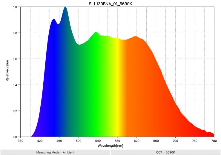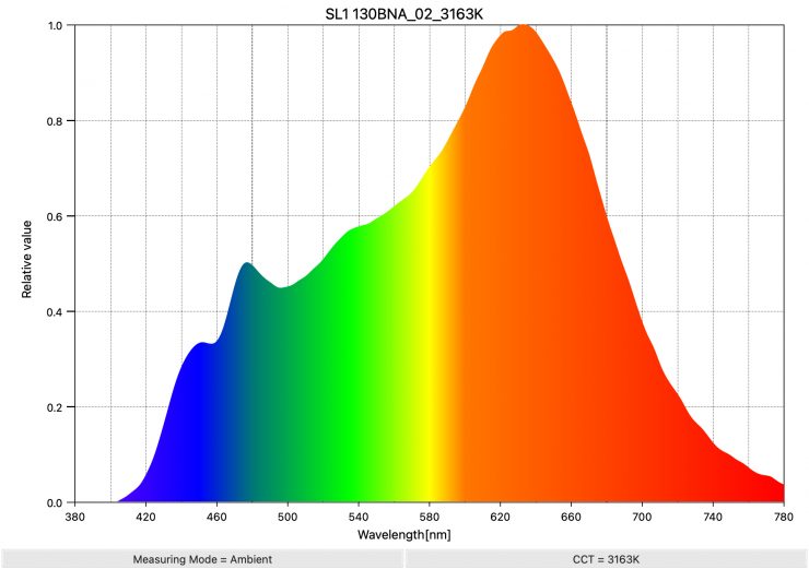 The TM30 test shows the 130BNA performing very well, with an Rf score of 94 (100 being perfect). An Rg rating (saturation) of 99 means the light is slightly undersaturated by -1%. Looking at the graph, you can see a bit of Magenta and yellow/green being the less saturated colors.