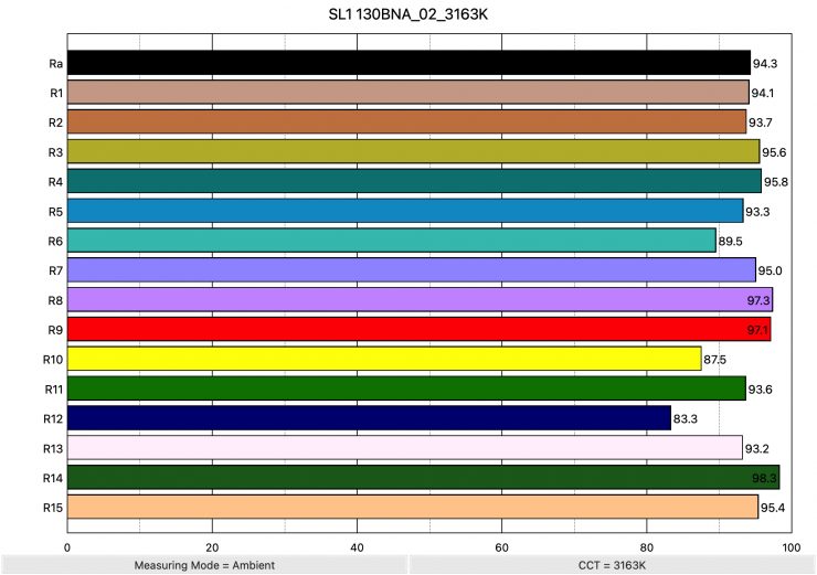 The CRI also looks good, with a Ra (average CRI) of 94.3 and an extended rating of 93.51. This is a very good score. As you can see, some individual colors, such as R12 dark blue and R10, scored under 90, but the R13, R14, and R1, which are in the skin tone range, did very well in the mid-90s.