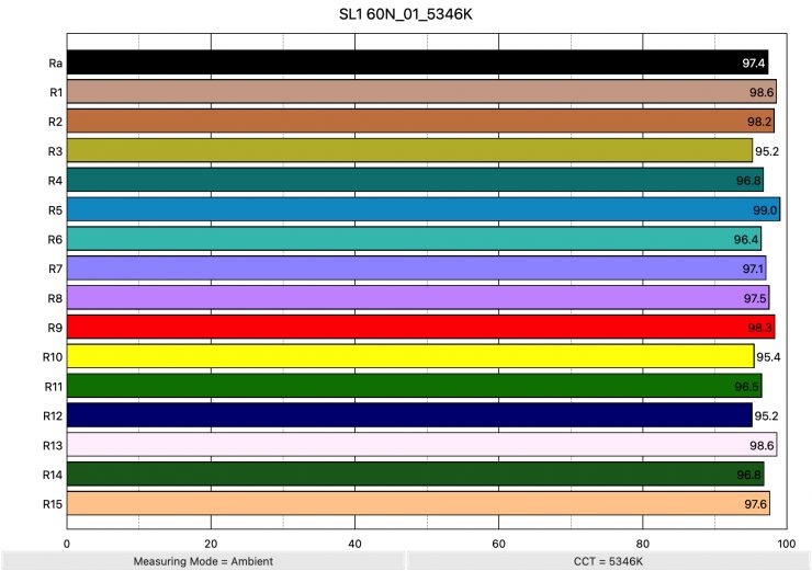 The CRI also looks great, with a Ra (average CRI) of 97.4 and an extended rating of 97.14. This is an excellent score. As you can see, the individual colors are very close to being similar without any big differences.
